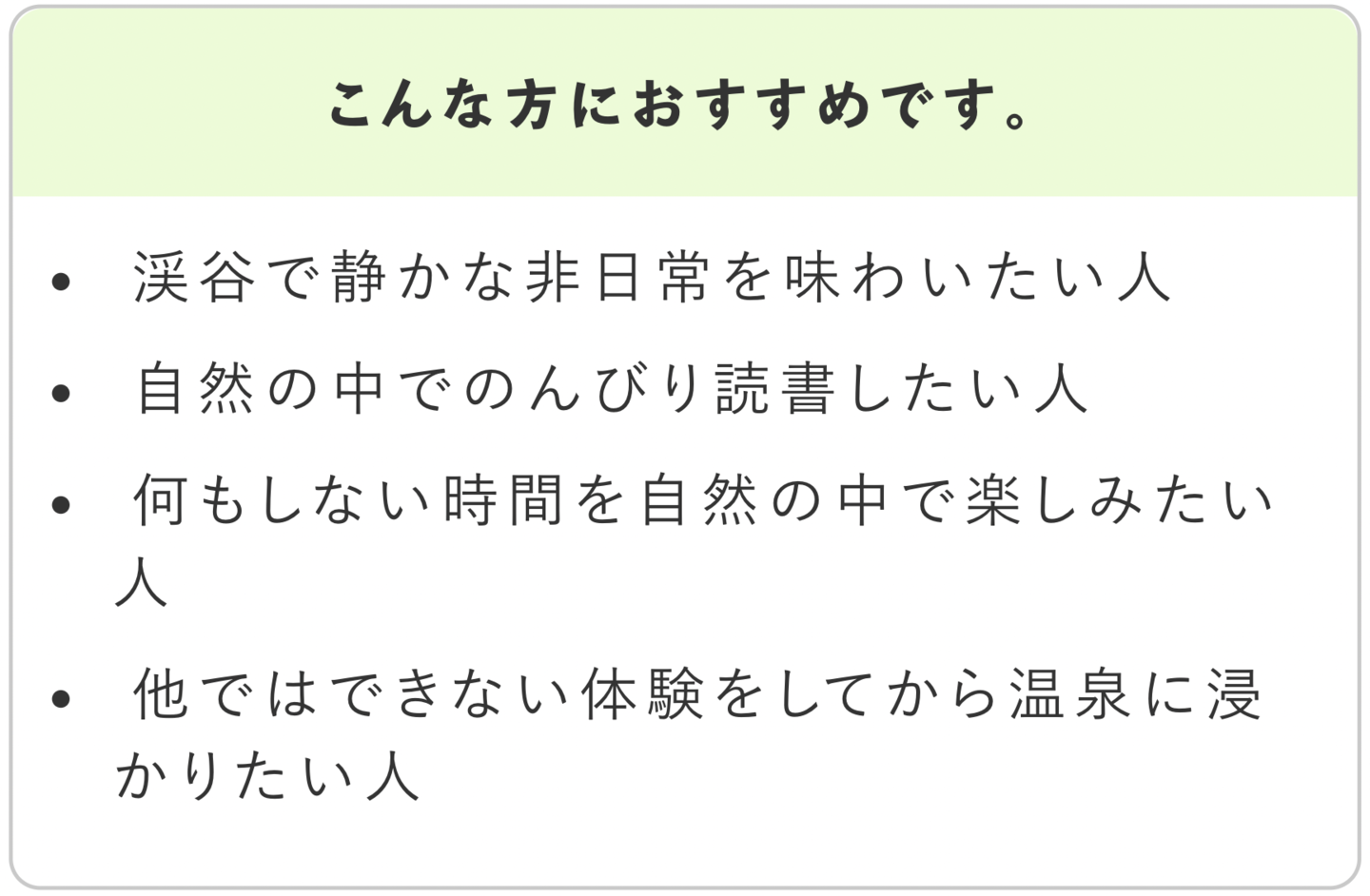 自然の中で座って読む本や、飲み物やちょっとしたおやつなどを持って行くとより楽しめます。